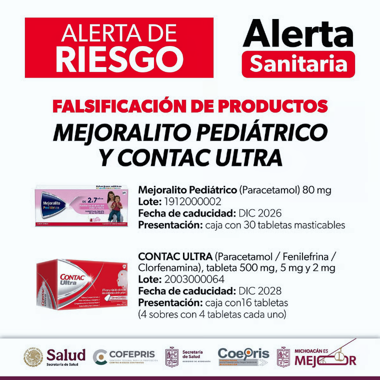 La Comisión Federal para la Protección contra Riesgos Sanitarios (Cofepris), por medio de la Secretaría de Salud del Estado (SSM), comunica a la ciudadanía sobre la existencia de medicamentos falsificados como Mejoralito pediátrico y Contac Ultra, los cuales suponen un peligro para la salud.