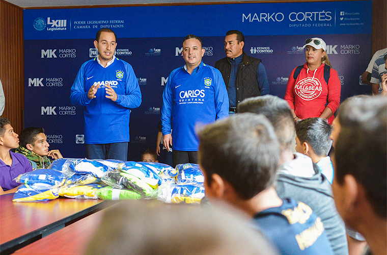 Portando una de las camisetas del equipo, el diputado federal Marko Cortés Mendoza hizo hincapié en la importancia de que las autoridades fomenten las habilidades de la juventud, ya que ello, contribuye a lograr el empoderamiento de este sector golpeado en Michoacán por la deserción escolar, el desempleo y las adicciones.