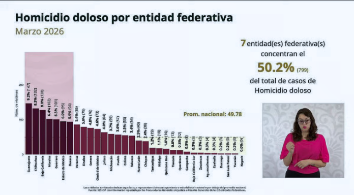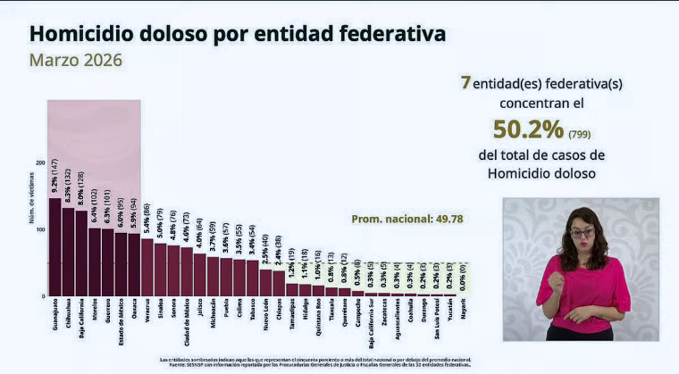 Figueroa Franco especificó que, según datos oficiales, siete entidades federativas acogen el 50. 2% de todos los homicidios dolosos ocurridos en marzo, incluyendo a Guanajuato, Chihuahua, Baja California, Morelos, Guerrero, el Estado de México y Oaxaca.