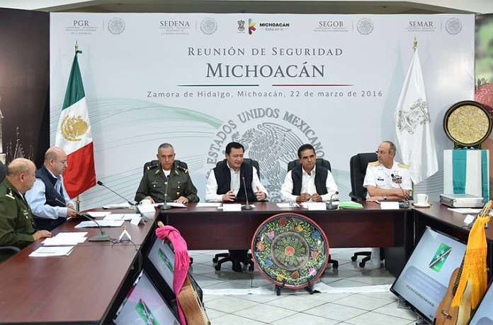 Acompañados de los integrantes del Gabinete de Seguridad del Gobierno de la República, general Salvador Cienfuegos Zepeda, secretario de la Defensa Nacional; secretario de Marina, almirante Vidal Francisco Soberón Sanz; el comisionado Nacional de Seguridad, Renato Sales Heredia, y el director del Centro de Investigación y Seguridad Nacional, Eugenio Ímaz Gispert, el Secretario de Gobernación y el Gobernador de Michoacán, supervisaron el avance de los trabajos conjuntos para garantizar la seguridad de las y los michoacanos.