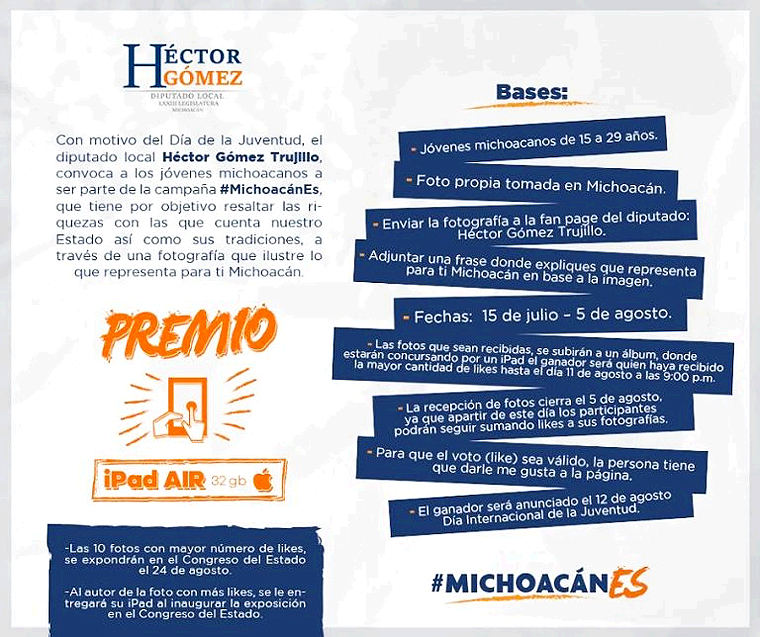 Michoacán es… una campaña que anunció el diputado del Partido Acción Nacional, Héctor Gómez Trujillo, mediante la cual los jóvenes podrán participar con fotografías y frases sobre el estado.