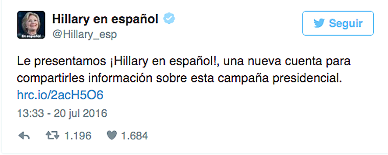Nada perdidos los de la campaña de Hillary CLinton, la virtual candidata del Partido Demócrata a la Casa Blanca, Hillary Clinton , lanzó una cuenta de Twitter en español (@Hillary_esp) en un esfuerzo para acercarse aún más a la comunidad latina en Estados Unidos, en fuerte contraste con las políticas anti-inmigrantes de su rival republicano.