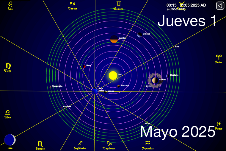 Hoy es Jueves 1 de Mayo es el día número 121 y faltan por transcurrir 244 días, es la semana número 18, decimoctavo Jueves de 2025, van 42 días de Primavera y faltan 50 días para la Verano. La piedra de nacimiento para este mes es Esmeralda. Es el día lunar número 4 del mes lunar 4, la Luna está en su fase Media Luna Creciente y bajo el signo Desde 07:23 am Cáncer que tiene influencia en los siguientes órganos: Estómago, mucosas, mama, útero, ovario. El símbolo del día lunar es: Árbol del conocimiento