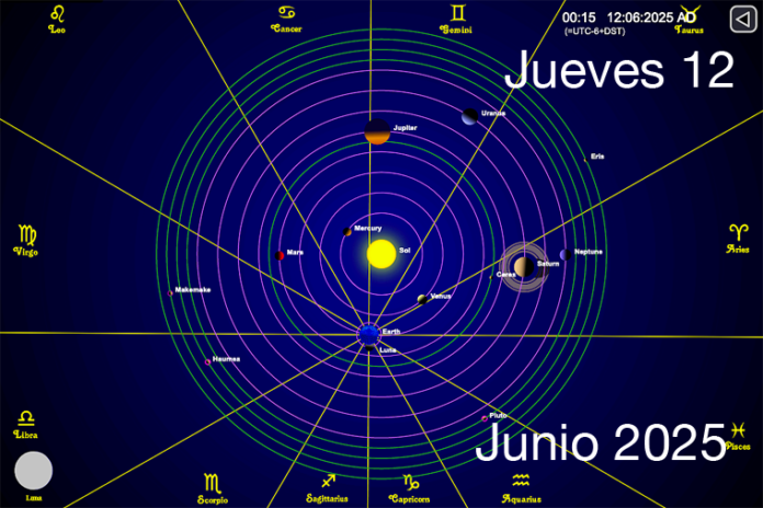 Hoy es Jueves 12 de Junio es el día número 163 y faltan por transcurrir 202 días, es la semana número 24, vigésimo cuarto Jueves de 2025, van 84 días de Primavera y faltan 8 días para la Verano. La piedra de nacimiento para este mes es Alejandrina, Perla y Piedra Lunar. Es el día lunar número 17 del mes lunar 5, la Luna está en su fase Gibosa Menguante y bajo el signo Desde 01:55 am Capricornio que tiene influencia en los siguientes órganos: Columna vertebral, articulaciones, rodillas, piel, cabello. El símbolo del día lunar es: Shakti