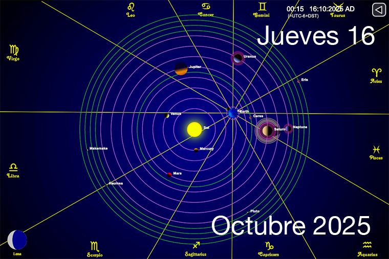 Hoy es Jueves 16 de Octubre es el día número 289 y faltan por transcurrir 76 días, es la semana número 42, cuadragésimo segundo Jueves de 2025, van 24 días de Otoño y faltan 66 días para la Invierno. La piedra de nacimiento para este mes es Ópalo y Turmalina. Es el día lunar número 25 del mes lunar 8, la Luna está en su fase Media Luna Menguante y bajo el signo Leo desde 18:06 (6:06 pm) Virgo que tiene influencia en los siguientes órganos: Corazón, aorta, presión arterial, circulación sanguínea. El símbolo del día lunar es: Tortuga