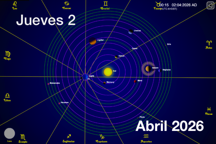 Hoy es Jueves 2 de Abril es el día número 92 y faltan por transcurrir 273 días, es la semana número 14, decimocuarto Jueves de 2026, van 13 días de Primavera y faltan 80 días para la Verano. La piedra de nacimiento para este mes es Diamante y Cristal. Es el día lunar número 15 del mes lunar 2, la Luna está en su fase Gibosa Menguante y bajo el signo Luna llena a las 3:11 a.m., Luna en Libra, Sol en Aries que tiene influencia en los siguientes órganos: Riñón, Uréter, Vejiga Urinaria, Venas, Piel. El símbolo del día lunar es: Serpiente Ardiente