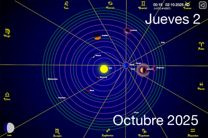 Hoy es Jueves 2 de Octubre es el día número 275 y faltan por transcurrir 90 días, es la semana número 40, cuadragésimo Jueves de 2025, van 10 días de Otoño y faltan 80 días para la Invierno. La piedra de nacimiento para este mes es Ópalo y Turmalina. Es el día lunar número 11 del mes lunar 8, la Luna está en su fase Gibosa Creciente y bajo el signo Acuario que tiene influencia en los siguientes órganos: Pantorrilla, tobillo, espinilla, tendón de Aquiles. El símbolo del día lunar es: Kundalini