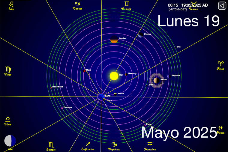 Hoy es Lunes 19 de Mayo es el día número 139 y faltan por transcurrir 226 días, es la semana número 20, vigésimo Lunes de 2025, van 60 días de Primavera y faltan 32 días para la Verano. La piedra de nacimiento para este mes es Esmeralda. Es el día lunar número 22 del mes lunar 4, la Luna está en su fase Gibosa Menguante y bajo el signo Acuario que tiene influencia en los siguientes órganos: Pantorrilla, tobillo, espinilla, tendón de Aquiles. El símbolo del día lunar es: Ganesha