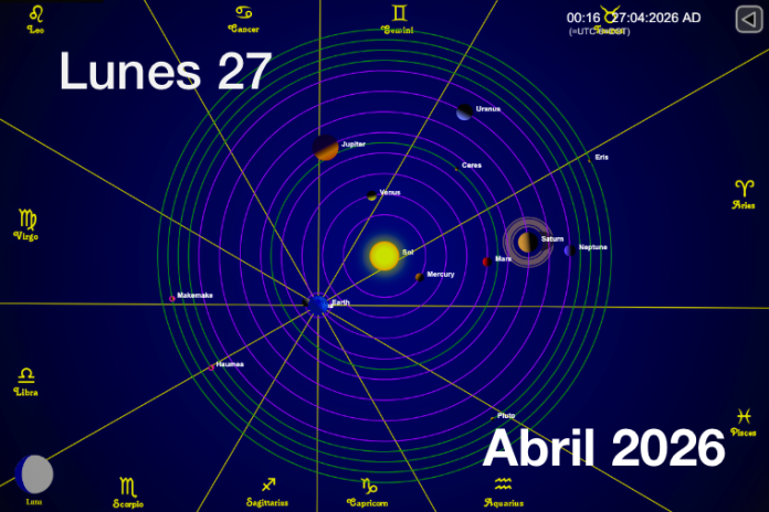 Hoy es Lunes 27 de Abril es el día número 117 y faltan por transcurrir 248 días, es la semana número 17, decimoséptimo Lunes de 2026, van 38 días de Primavera y faltan 55 días para la Verano. La piedra de nacimiento para este mes es Diamante y Cristal. Es el día lunar número 11 del mes lunar 3, la Luna está en su fase Gibosa Creciente y bajo el signo Luna en Aries que tiene influencia en los siguientes órganos: Páncreas, Intestino Delgado, Tracto Digestivo. El símbolo del día lunar es: Kundalini