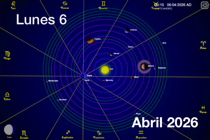 Hoy es Lunes 6 de Abril es el día número 96 y faltan por transcurrir 269 días, es la semana número 14, decimocuarto Lunes de 2026, van 17 días de Primavera y faltan 76 días para la Verano. La piedra de nacimiento para este mes es Diamante y Cristal. Es el día lunar número 19 del mes lunar 2, la Luna está en su fase Gibosa Menguante y bajo el signo Luna en Libra que tiene influencia en los siguientes órganos: Hígado, Caderas, Muslos, Sacro. El símbolo del día lunar es: Araña