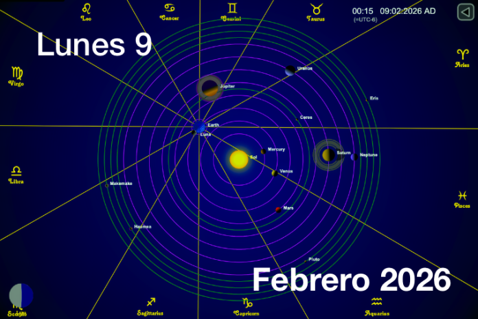 Hoy es Lunes 9 de Febrero es el día número 40 y faltan por transcurrir 325 días, es la semana número 6, sexto Lunes de 2026, van 50 días de Invierno y faltan 39 días para la Primavera. La piedra de nacimiento para este mes es Amatista. Es el día lunar número 22 del mes lunar 12, la Luna está en su fase Último Cuarto 6:44 A.M. y bajo el signo Luna en Leo que tiene influencia en los siguientes órganos: Genitales, Ano, Uretra, Próstata. El símbolo del día lunar es: Ganesha