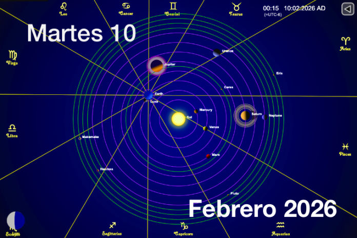 Hoy es Martes 10 de Febrero es el día número 41 y faltan por transcurrir 324 días, es la semana número 6, sexto Martes de 2026, van 51 días de Invierno y faltan 38 días para la Primavera. La piedra de nacimiento para este mes es Amatista. Es el día lunar número 23 del mes lunar 12, la Luna está en su fase Media Luna Menguante y bajo el signo Luna en Leo que tiene influencia en los siguientes órganos: Hígado, Caderas, Muslos, Sacro. El símbolo del día lunar es: Cocodrilo Makkara