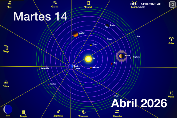 Hoy es Martes 14 de Abril es el día número 104 y faltan por transcurrir 261 días, es la semana número 15, decimoquinto Martes de 2026, van 25 días de Primavera y faltan 68 días para la Verano. La piedra de nacimiento para este mes es Diamante y Cristal. Es el día lunar número 27 del mes lunar 2, la Luna está en su fase Media Luna Menguante y bajo el signo Luna en Libra que tiene influencia en los siguientes órganos: Pies, Dedos De Los Pies, Glándula Pineal. El símbolo del día lunar es: Tridente