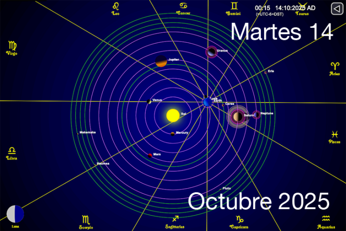 Hoy es Martes 14 de Octubre es el día número 287 y faltan por transcurrir 78 días, es la semana número 42, cuadragésimo primer Martes de 2025, van 22 días de Otoño y faltan 68 días para la Invierno. La piedra de nacimiento para este mes es Ópalo y Turmalina. Es el día lunar número 23 del mes lunar 8, la Luna está en su fase Media Luna Menguante y bajo el signo Desde 10:47 am Leo que tiene influencia en los siguientes órganos: Corazón, aorta, presión arterial, circulación sanguínea. El símbolo del día lunar es: Cocodrilo Makkara