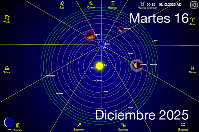 Hoy es Martes 16 de Diciembre es el día número 350 y faltan por transcurrir 15 días, es la semana número 51, quincuagésimo Martes de 2025, van 85 días de Otoño y faltan 5 días para la Invierno. La piedra de nacimiento para este mes es Turquesa y Topacio Azul. Es el día lunar número 27 del mes lunar 10, la Luna está en su fase Media Luna Menguante y bajo el signo Escorpión que tiene influencia en los siguientes órganos: Genitales, ano, uretra, próstata. El símbolo del día lunar es: Tridente