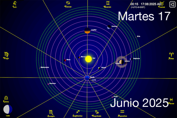 Hoy es Martes 17 de Junio es el día número 168 y faltan por transcurrir 197 días, es la semana número 25, vigésimo cuarto Martes de 2025, van 89 días de Primavera y faltan 3 días para la Verano. La piedra de nacimiento para este mes es Alejandrina, Perla y Piedra Lunar. Es el día lunar número 22 del mes lunar 5, la Luna está en su fase Gibosa Menguante y bajo el signo Piscis que tiene influencia en los siguientes órganos: Pies, dedos de los pies, glándula pineal. El símbolo del día lunar es: Ganesha
