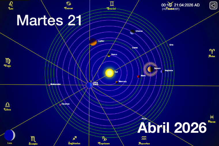 Hoy es Martes 21 de Abril es el día número 111 y faltan por transcurrir 254 días, es la semana número 16, decimosexto Martes de 2026, van 32 días de Primavera y faltan 61 días para la Verano. La piedra de nacimiento para este mes es Diamante y Cristal. Es el día lunar número 5 del mes lunar 3, la Luna está en su fase Media Luna Creciente y bajo el signo Luna en Aries que tiene influencia en los siguientes órganos: Hombros, Brazos, Manos, Bronquios, Pulmones. El símbolo del día lunar es: Unicornio
