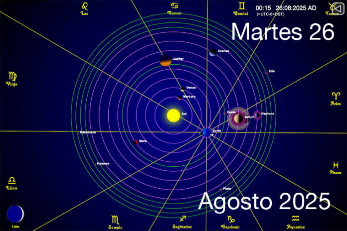 Hoy es Martes 26 de Agosto es el día número 238 y faltan por transcurrir 127 días, es la semana número 35, trigésimo cuarto Martes de 2025, van 67 días de Verano y faltan 27 días para la Otoño. La piedra de nacimiento para este mes es Peridoto. Es el día lunar número 4 del mes lunar 7, la Luna está en su fase Media Luna Creciente y bajo el signo Libra que tiene influencia en los siguientes órganos: Riñón, uréter, vejiga urinaria, venas, piel. El símbolo del día lunar es: Árbol del conocimiento