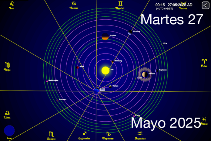 Hoy es Martes 27 de Mayo es el día número 147 y faltan por transcurrir 218 días, es la semana número 22, vigésimo primer Martes de 2025, van 68 días de Primavera y faltan 24 días para la Verano. La piedra de nacimiento para este mes es Esmeralda. Es el día lunar número 1 del mes lunar 5, la Luna está en su fase Nueva Luna a las 03:02 y bajo el signo Géminis que tiene influencia en los siguientes órganos: Hombros, brazos, manos, bronquios, pulmones. El símbolo del día lunar es: Vela