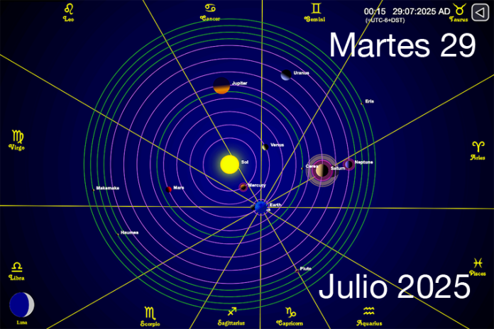 Hoy es Martes 29 de Julio es el día número 210 y faltan por transcurrir 155 días, es la semana número 31, trigésimo Martes de 2025, van 39 días de Verano y faltan 55 días para la Otoño. La piedra de nacimiento para este mes es Rubí y Onyx. Es el día lunar número 5 del mes lunar 6, la Luna está en su fase Media Luna Creciente y bajo el signo Desde 05:43 am Libra que tiene influencia en los siguientes órganos: Riñón, uréter, vejiga urinaria, venas, piel. El símbolo del día lunar es: Unicornio