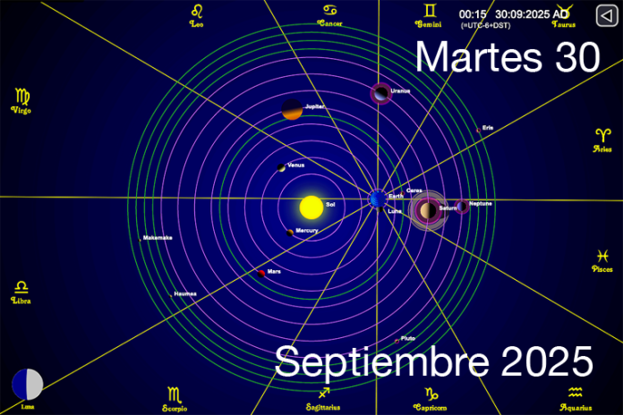 Hoy es Martes 30 de Septiembre es el día número 273 y faltan por transcurrir 92 días, es la semana número 40, trigésimo noveno Martes de 2025, van 8 días de Otoño y faltan 82 días para la Invierno. La piedra de nacimiento para este mes es Ópalo y Turmalina. Es el día lunar número 9 del mes lunar 8, la Luna está en su fase Primer Cuarto y bajo el signo Capricornio que tiene influencia en los siguientes órganos: Columna vertebral, articulaciones, rodillas, piel, cabello. El símbolo del día lunar es: Murciélago
