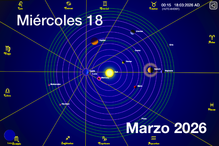 Hoy es Miércoles 18 de Marzo es el día número 77 y faltan por transcurrir 288 días, es la semana número 12, undécimo Miércoles de 2026, van 87 días de Invierno y faltan 2 días para la Primavera. La piedra de nacimiento para este mes es Aquamarina, Piedra de Sangre y Jade. Es el día lunar número 30 del mes lunar 1, la Luna está en su fase Nueva Luna 8:26 P.M. y bajo el signo Luna en Virgo que tiene influencia en los siguientes órganos: Pies, Dedos De Los Pies, Glándula Pineal. El símbolo del día lunar es: Cisne Dorado