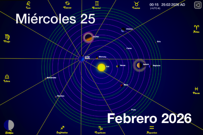 Hoy es Miércoles 25 de Febrero es el día número 56 y faltan por transcurrir 309 días, es la semana número 8, octavo Miércoles de 2026, van 66 días de Invierno y faltan 23 días para la Primavera. La piedra de nacimiento para este mes es Amatista. Es el día lunar número 9 del mes lunar 1, la Luna está en su fase Gibosa Creciente y bajo el signo Luna en Acuario que tiene influencia en los siguientes órganos: Hombros, Brazos, Manos, Bronquios, Pulmones. El símbolo del día lunar es: Murciélago
