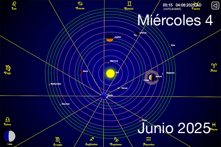 Hoy es Miércoles 4 de Junio es el día número 155 y faltan por transcurrir 210 días, es la semana número 23, vigésimo tercer Miércoles de 2025, van 76 días de Primavera y faltan 16 días para la Verano. La piedra de nacimiento para este mes es Alejandrina, Perla y Piedra Lunar. Es el día lunar número 9 del mes lunar 5, la Luna está en su fase Gibosa Creciente y bajo el signo Virgo desde 13:39 (1:39 pm) Libra que tiene influencia en los siguientes órganos: Páncreas, intestino delgado, tracto digestivo. El símbolo del día lunar es: Murciélago