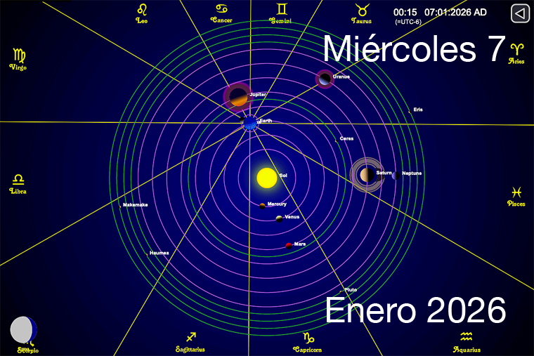| Saturno | Mie 11:29 am | Mie 11:22 pm | Mie 5:25 pm | Visibilidad media |