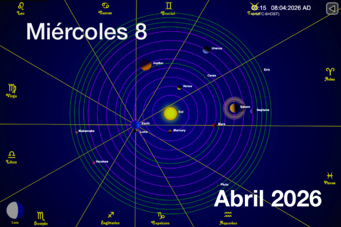 Hoy es Miércoles 8 de Abril es el día número 98 y faltan por transcurrir 267 días, es la semana número 15, decimocuarto Miércoles de 2026, van 19 días de Primavera y faltan 74 días para la Verano. La piedra de nacimiento para este mes es Diamante y Cristal. Es el día lunar número 21 del mes lunar 2, la Luna está en su fase Gibosa Menguante y bajo el signo Luna en Libra que tiene influencia en los siguientes órganos: Hígado, Caderas, Muslos, Sacro. El símbolo del día lunar es: Manada de Caballos