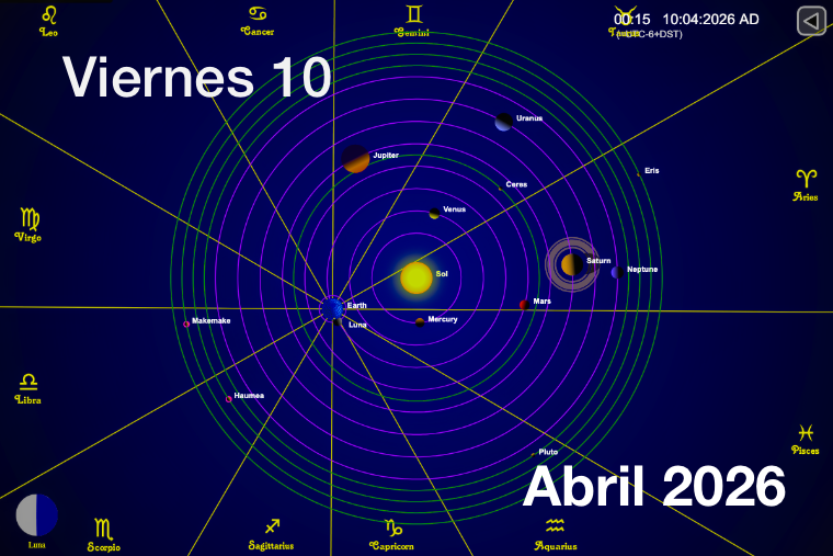 Hoy es Viernes 10 de Abril es el día número 100 y faltan por transcurrir 265 días, es la semana número 15, decimoquinto Viernes de 2026, van 21 días de Primavera y faltan 72 días para la Verano. La piedra de nacimiento para este mes es Diamante y Cristal. Es el día lunar número 23 del mes lunar 2, la Luna está en su fase Media Luna Menguante y bajo el signo Luna en Libra que tiene influencia en los siguientes órganos: Columna Vertebral, Articulaciones, Rodillas, Piel, Cabello. El símbolo del día lunar es: Cocodrilo Makkara