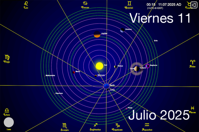 Hoy es Viernes 11 de Julio es el día número 192 y faltan por transcurrir 173 días, es la semana número 28, vigésimo octavo Viernes de 2025, van 21 días de Verano y faltan 73 días para la Otoño. La piedra de nacimiento para este mes es Rubí y Onyx. Es el día lunar número 17 del mes lunar 6, la Luna está en su fase Gibosa Menguante y bajo el signo Capricornio desde 17:21 (5:21 pm) Acuario que tiene influencia en los siguientes órganos: Columna vertebral, articulaciones, rodillas, piel, cabello. El símbolo del día lunar es: Shakti