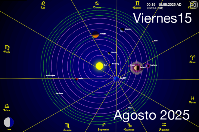 Hoy es Viernes 15 de Agosto es el día número 227 y faltan por transcurrir 138 días, es la semana número 33, trigésimo tercer Viernes de 2025, van 56 días de Verano y faltan 38 días para la Otoño. La piedra de nacimiento para este mes es Peridoto. Es el día lunar número 22 del mes lunar 6, la Luna está en su fase Gibosa Menguante y bajo el signo Tauro que tiene influencia en los siguientes órganos: Cuello, cuerdas vocales, garganta, glándula tiroides. El símbolo del día lunar es: Ganesha
