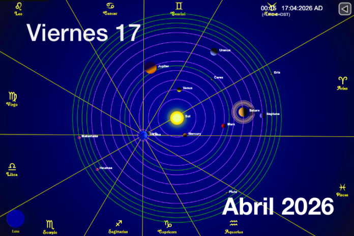 Hoy es Viernes 17 de Abril es el día número 107 y faltan por transcurrir 258 días, es la semana número 16, decimosexto Viernes de 2026, van 28 días de Primavera y faltan 65 días para la Verano. La piedra de nacimiento para este mes es Diamante y Cristal. Es el día lunar número 1 del mes lunar 3, la Luna está en su fase Nueva Luna 6:54 A.M. y bajo el signo Luna nueva a las 12:51 a.m., Luna en Aries, Sol en Aries que tiene influencia en los siguientes órganos: Cabeza, Dientes, Lengua, Arterias. El símbolo del día lunar es: Vela