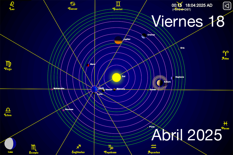 Hoy es Viernes 18 de Abril es el día número 108 y faltan por transcurrir 257 días, es la semana número 16, decimosexto Viernes de 2025, van 29 días de Primavera y faltan 63 días para la Verano. La piedra de nacimiento para este mes es Diamante y Cristal. Es el día lunar número 21 del mes lunar 3, la Luna está en su fase Gibosa Menguante y bajo el signo Sagitario desde 14:12 (2:12 pm) Capricornio que tiene influencia en los siguientes órganos: Hígado, caderas, muslos, sacro. El símbolo del día lunar es: Manada de Caballos