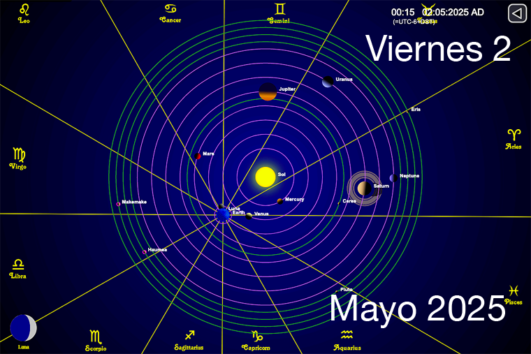 | Saturno | Sáb 3:56 am | Sáb 3:51 pm | Sáb 9:53 am | Visibilidad media |