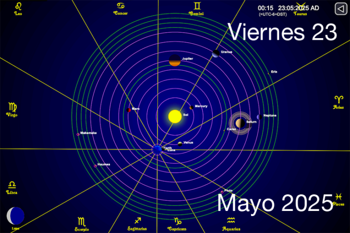 Hoy es Viernes 23 de Mayo es el día número 143 y faltan por transcurrir 222 días, es la semana número 21, vigésimo primer Viernes de 2025, van 64 días de Primavera y faltan 28 días para la Verano. La piedra de nacimiento para este mes es Esmeralda. Es el día lunar número 26 del mes lunar 4, la Luna está en su fase Media Luna Menguante y bajo el signo Aries que tiene influencia en los siguientes órganos: Cabeza, dientes, lengua, arterias. El símbolo del día lunar es: Pantano