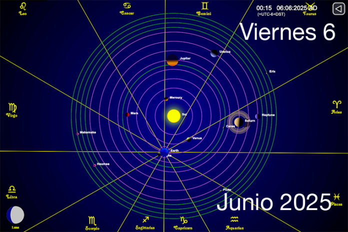 Hoy es Viernes 6 de Junio es el día número 157 y faltan por transcurrir 208 días, es la semana número 23, vigésimo tercer Viernes de 2025, van 78 días de Primavera y faltan 14 días para la Verano. La piedra de nacimiento para este mes es Alejandrina, Perla y Piedra Lunar. Es el día lunar número 11 del mes lunar 5, la Luna está en su fase Gibosa Creciente y bajo el signo Libra que tiene influencia en los siguientes órganos: Riñón, uréter, vejiga urinaria, venas, piel. El símbolo del día lunar es: Kundalini