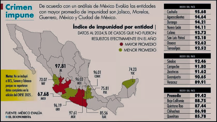 Por otro lado, el informe indica niveles alarmantes de impunidad en otras entidades, como Jalisco, que presenta un 97. 81 por ciento; Morelos, con un 97. 61 por ciento; y Guerrero, con un 96. 19 por ciento.