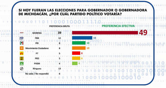 A poco más de doce meses de la elección, Morena no solo lidera, sino que controla el panorama electoral en Michoacán. Un sondeo realizado por la empresa Enkoll sitúa al partido guinda con un 49% de preferencia efectiva, una ventaja que elimina el verdadero margen de competencia ante una oposición desorganizada y debilitada.