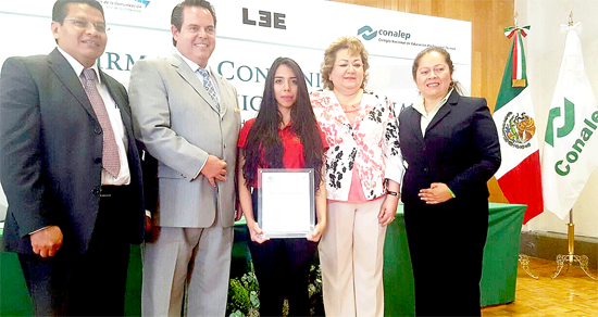 Wendy Jesús Ortiz Torres recibió de manos de la directora nacional del Conalep, Candita Victoria Gil Jiménez, y el presidente ejecutivo del Consejo de la Comunicación, Salvador Villalobos Gómez, un reconocimiento por su participación, así como una computadora de escritorio.
