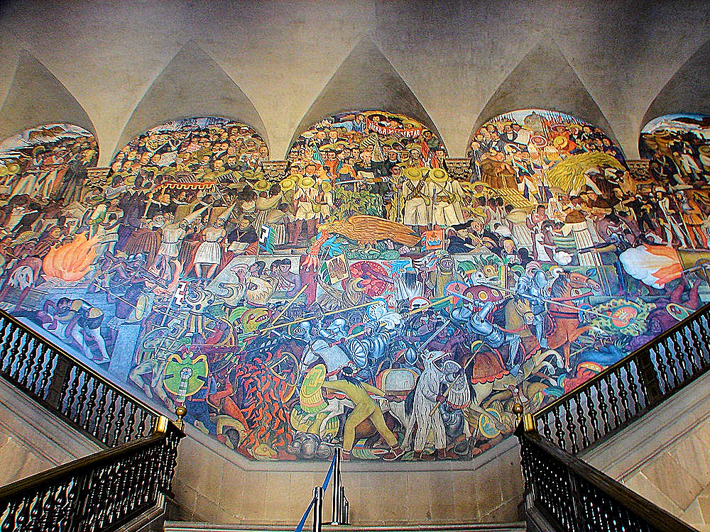 Rivera pinto la historia de México en tres muros del Palacio Nacional de Mexico DF. En el muro de la derecha Rivera pinto el mundo precolombino gobernada por el rey dios Quetzalcoalt. En el mural de la izquierda se muestra la revolución actual liderada por Karl Marx, que llevaba un fututo aparente de armonía entre la industria y la naturaleza. En el muro central muestra la conquista española del siglo XVI, en la parte inferior esta el príncipe azteca Cuauhtemoc y lucha contra Hernán Cortez, también se encuentran secuencias de cristianización y educación. En el arco central hay dirigentes de la revolución sosteniendo una cartel son su lema “Tierra y Libertad”.