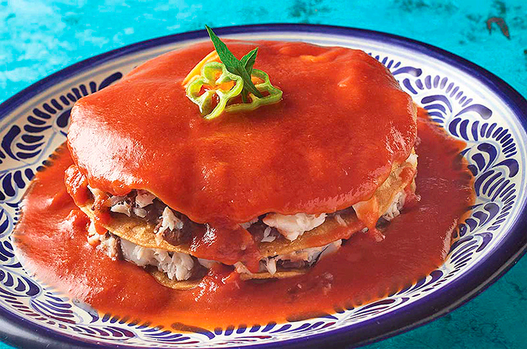 Cubre una cuarta tortilla con puré de frijol de un solo lado y ponla encima de las tres capas, con el lado de frijol hacia abajo. Vierte aprox. 1 1/2 tazas de la salsa de tomate encima. Acompaña con un habanero rostizado y con rebanadas de aguacate al lado. Repite el proceso 3 veces más hasta que tengas 4 torres.
