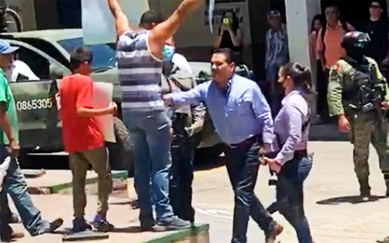 Impresionante el video que circula en la redes sociales en el cual el Gobernador del Estado enfrenta directamente a una persona que protesta con una cartulina. Protegido por el ejército y sus guaruras que no son pocos, se baja de una camioneta del ejército y camina para empujar al maestro (del cual no estoy seguro), porque según esto estaba provocando a la autoridad.