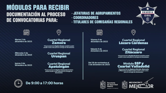 En Morelia, los módulos estarán operativos desde el 26 de noviembre hasta el 5 de diciembre, donde también se atenderá a los elementos de Maravatío y Pátzcuaro. Asimismo, se mantienen módulos permanentes en las instalaciones de la SSP y en el Cuartel de la Guardia Civil.