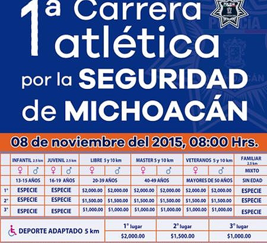 Como parte de las estrategias de proximidad social y con la finalidad de propiciar una sana convivencia con la ciudadanía, la Secretaría de Seguridad Pública de Michoacán en coordinación con la Comisión Estatal para la Cultura Física y Deporte (Cecufid) y la Asociación Michoacana de Atletismo, convocan a la Primera Carrera Atlética por la Seguridad de Michoacán 2015, denominada “Corre con tu Policía”; dicho evento se realizará el próximo 08 de noviembre, en punto de las 08:00 horas, y tendrá como salida y meta, la esquina en la que convergen las avenidas Camelinas y Ventura Puente, partiendo del mencionado lugar con rumbo al cruce con el Boulevard García de León, donde se dará el regreso hacia el punto de partida.